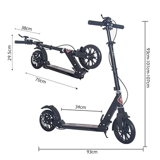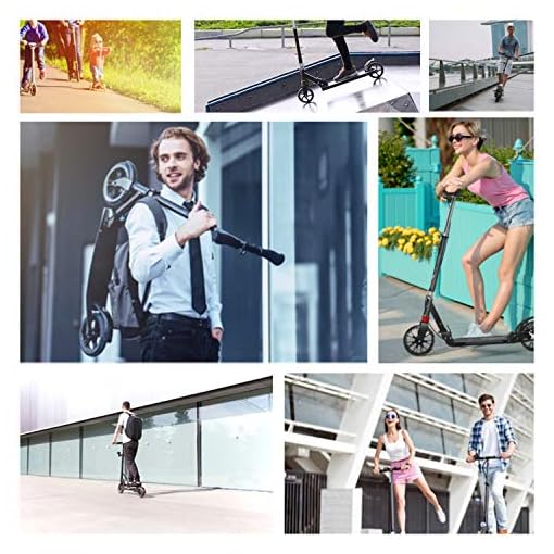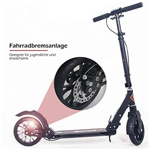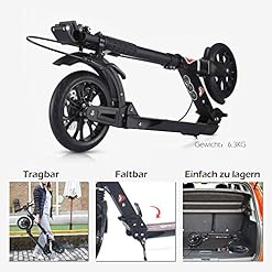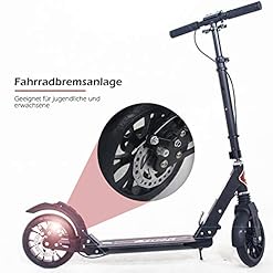 Material:das Wheel Scooter besteht aus Aluminiumlegierung. Reines Schwarz Tretroller sieht sehr erstklassig aus. Wichtige kleinere Teile wurden aus Stahl hergestellt,um einen perfekten zusammenhalt und die zuverlässige Stablilität zu gewählrleisten. Mit neusten Schreibenbremssystem und ergonomischer Griffe aus Gummi sowie hohe Flexibilität haben Sie bei einer guten Material-Qualität lange Fahrspass.