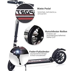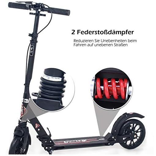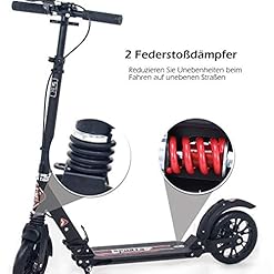 Sicherheit&Komfort:Doppelfedersystem und Präzisionskugellager ABEC-9 erheblich reduziert Vibration auf der flachen Straßen/ holprigen leiser fahren. 200mm big wheel mit einer Hinter- und Vorderradfederung bieten einen hohen Fahrkomfort und eine ruhige&schnelle Fahrt. Die Federung wird ein absolut angenehmes Fahrgefühl anbieten und reduzieren so manche Fuge oder Delle im Fahrbahnbelag. Die Höhe des Trittbrett ist 5cm,sodass mehr sicherheit ist,wenn Sie bergauf fahren.